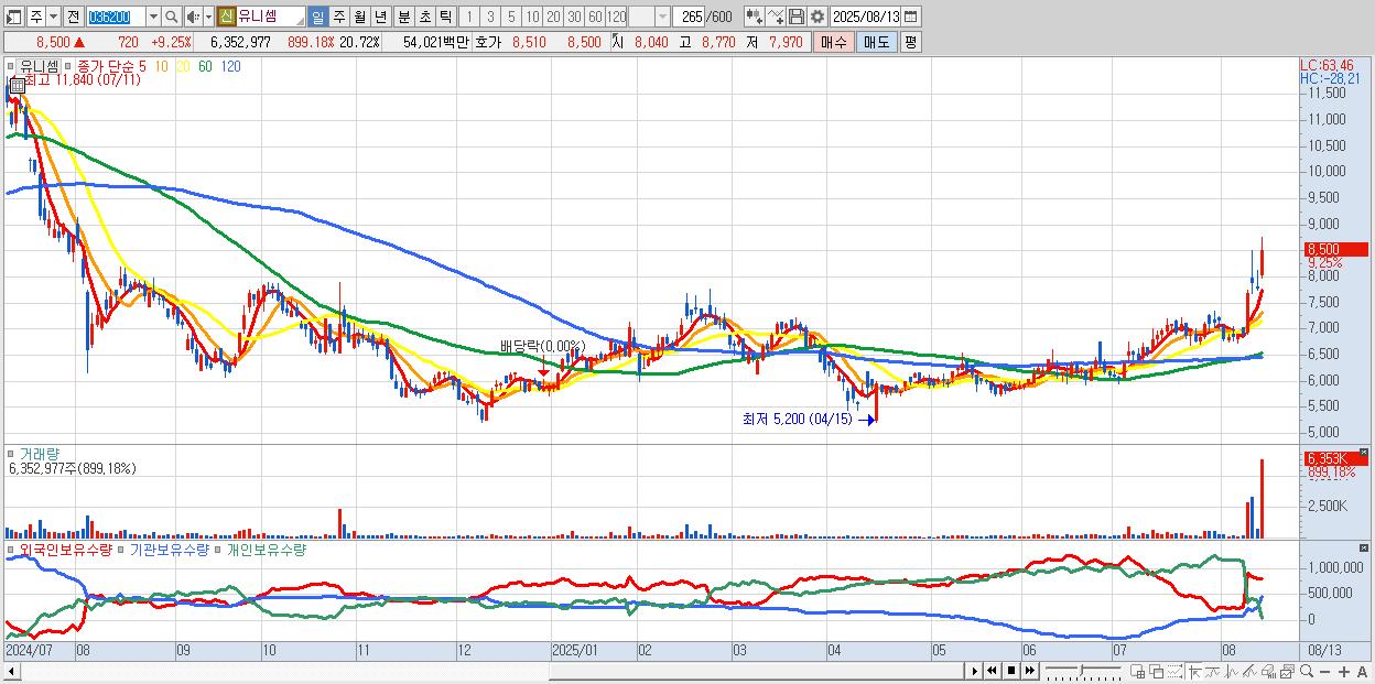 - 유니셈 (8,500원 ▲ 9.25% , 시총: 2,606억, 거래량: 6,352,977, 거래대금:540억)