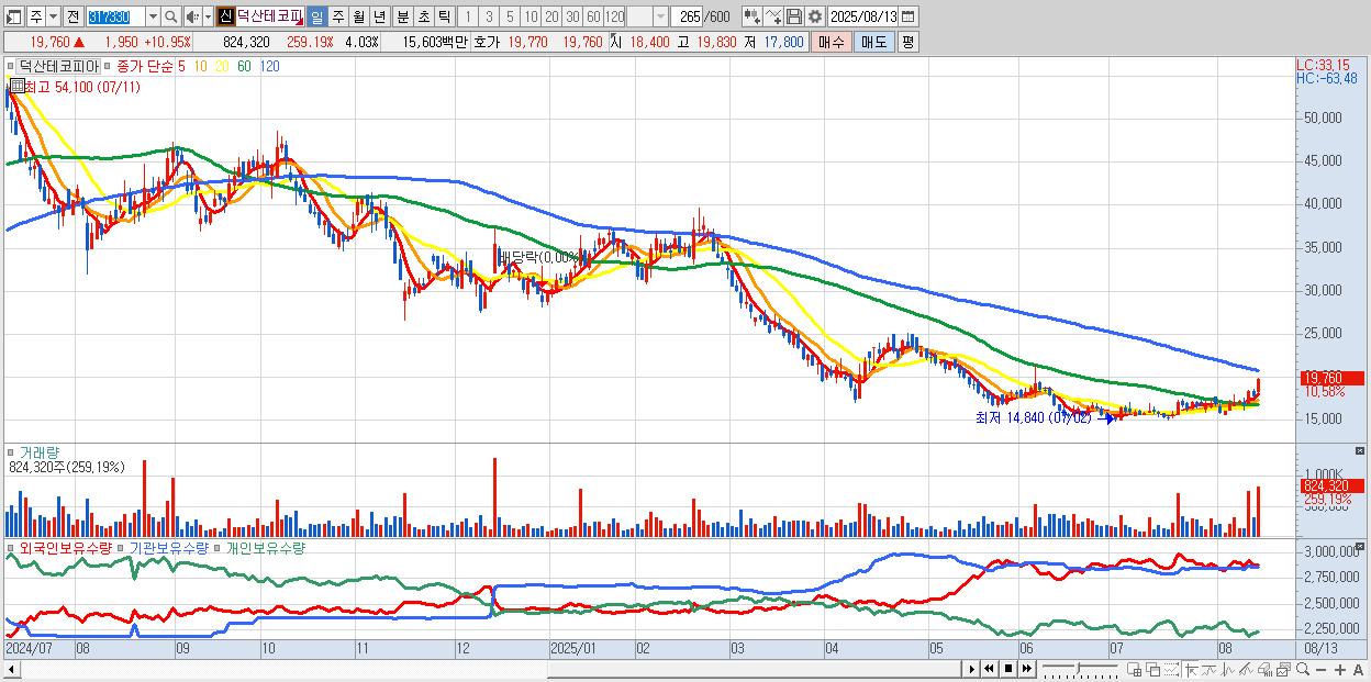 - 덕산테코피아 (19,640원 ▲ 10.28% , 시총: 4,022억, 거래량: 440,397, 거래대금:83억)