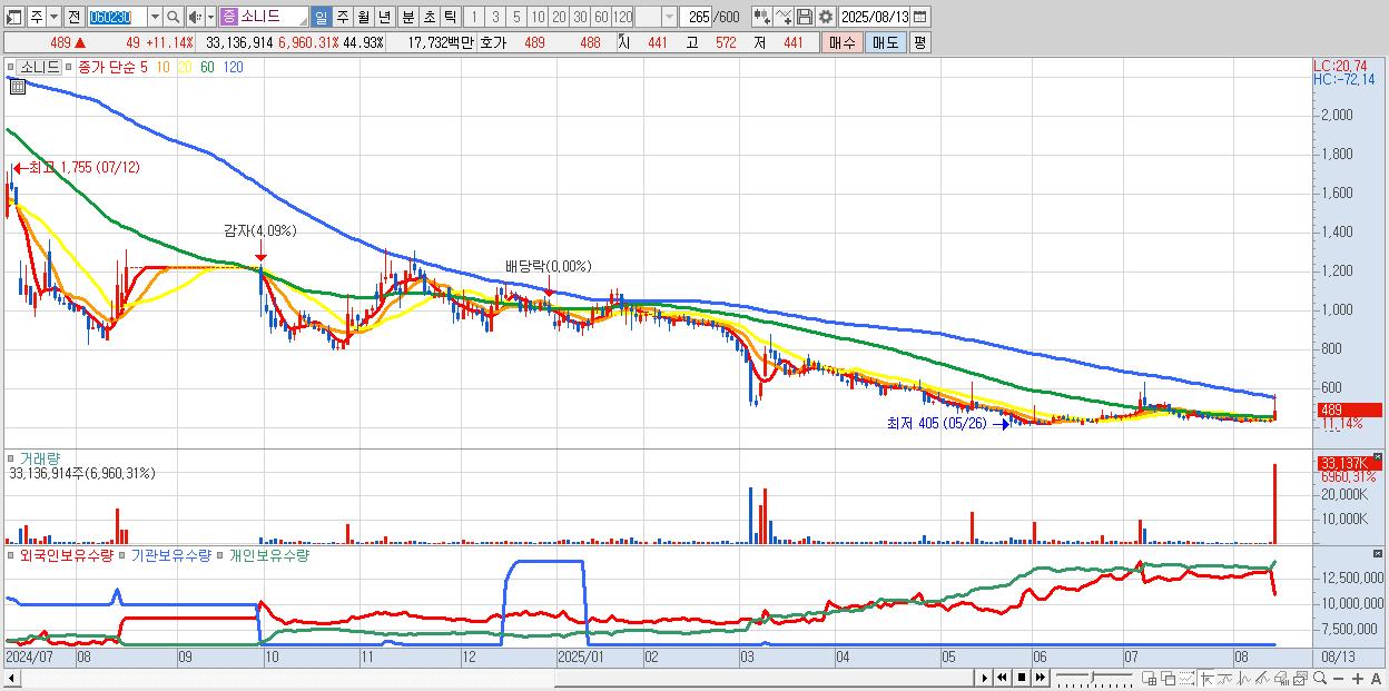 - 소니드 (489원 ▲ 11.14% , 시총: 361억, 거래량: 33,136,914, 거래대금:177억)