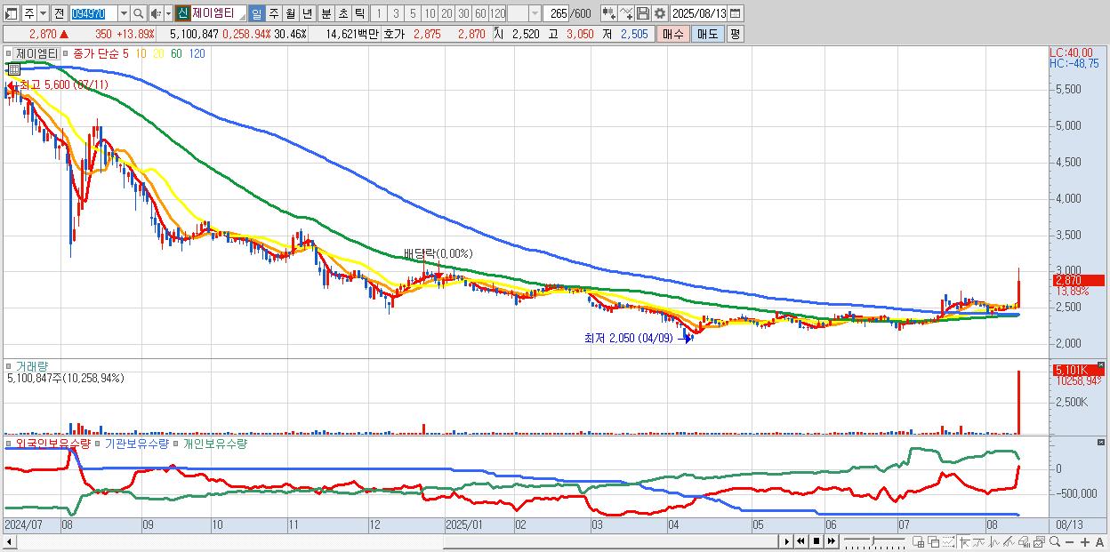 - 제이엠티 (2,870원 ▲ 13.89% , 시총: 481억, 거래량: 5,100,847, 거래대금:146억)