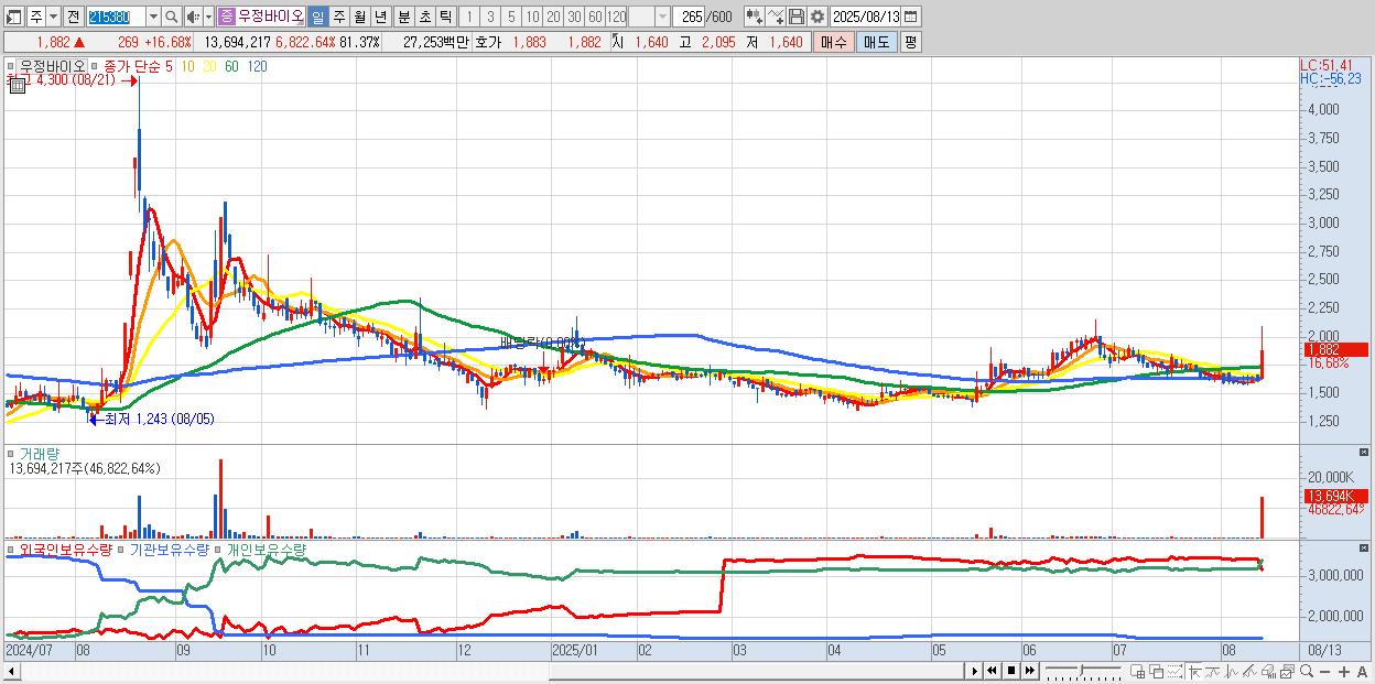 - 우정바이오 (1,882원 ▲ 16.68% , 시총: 317억, 거래량: 13,694,217, 거래대금:273억)