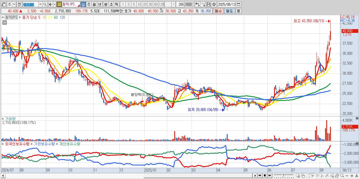- 원익IPS (40,900원 ▲ 7.35% , 시총: 20,075억, 거래량: 1,650,091, 거래대금:680억, KOSDAQ)
