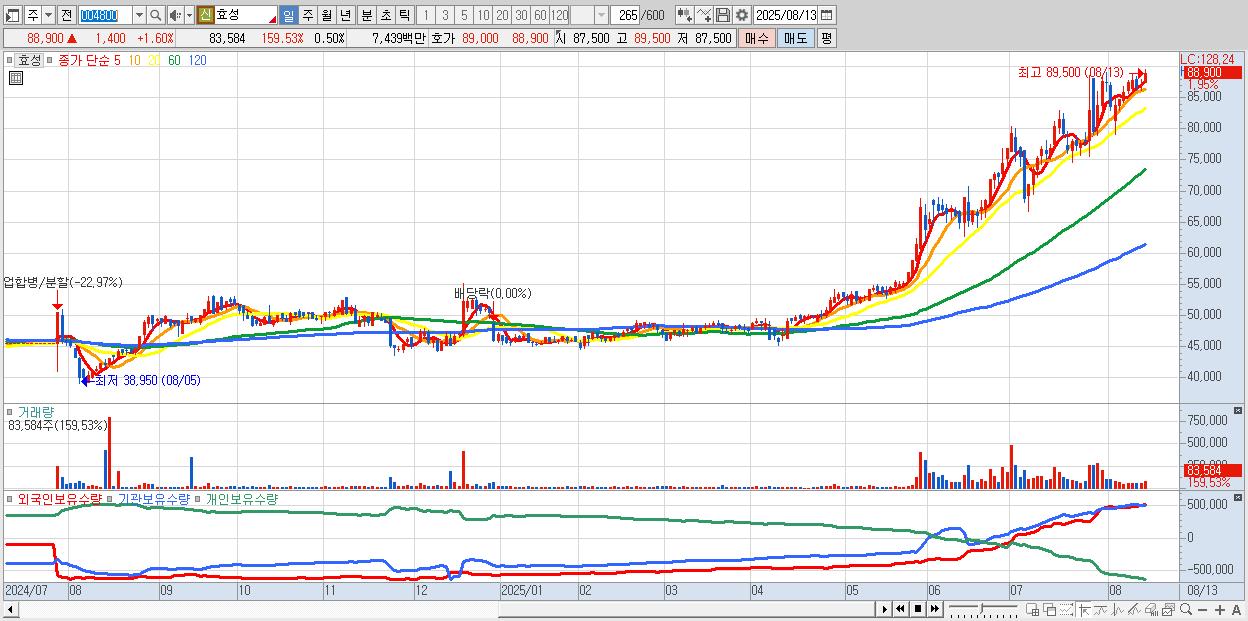 - 효성 (89,000원 ▲ 1.71% , 시총: 14,899억, 거래량: 62,082, 거래대금:55억, KOSPI)