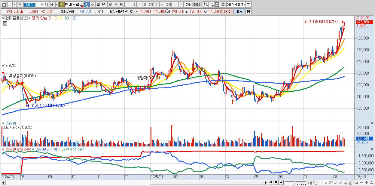 - 현대글로비스 (173,800원 ▲ 2.36% , 시총: 130,350억, 거래량: 271,067, 거래대금:469억, KOSPI)