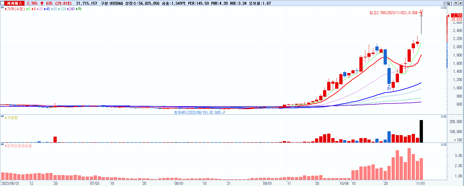 씨씨에스 2,765원 ▲ 29.81% (KOSDAQ, 066790)