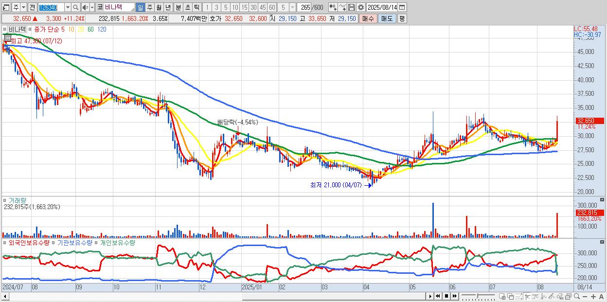 - 비나텍 (32,650원 ▲ 11.24% , 시총: 2,081억, 거래량: 232,815, 거래대금:74억)