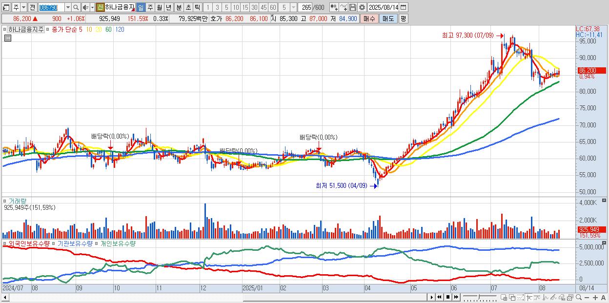 - 하나금융지주 (86,300원 ▲ 1.17% , 시총: 245,717억, 외국인 순매수 거래금:141억)