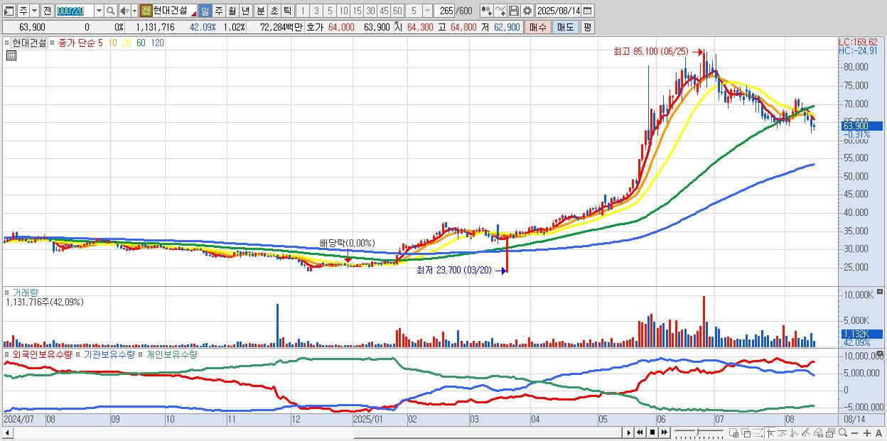 - 현대건설 (63,800원 ▼ -0.16% , 시총: 71,045억, 외국인 순매수 거래금:161억)