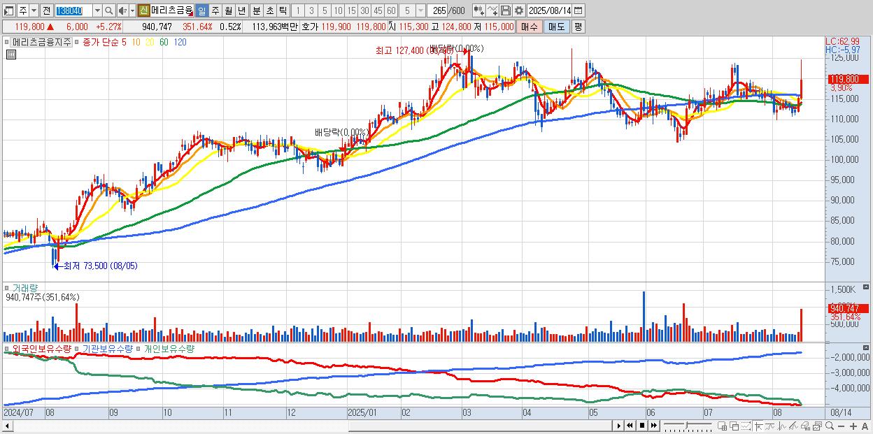 - 메리츠금융지주 (120,800원 ▲ 6.15% , 시총: 217,457억, 외국인 순매수 거래금:341억)