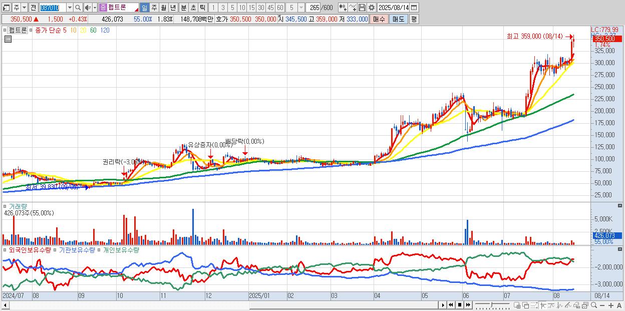 - 펩트론 (353,500원 ▲ 1.29% , 시총: 82,356억, 외국인 순매수 거래금:122억)