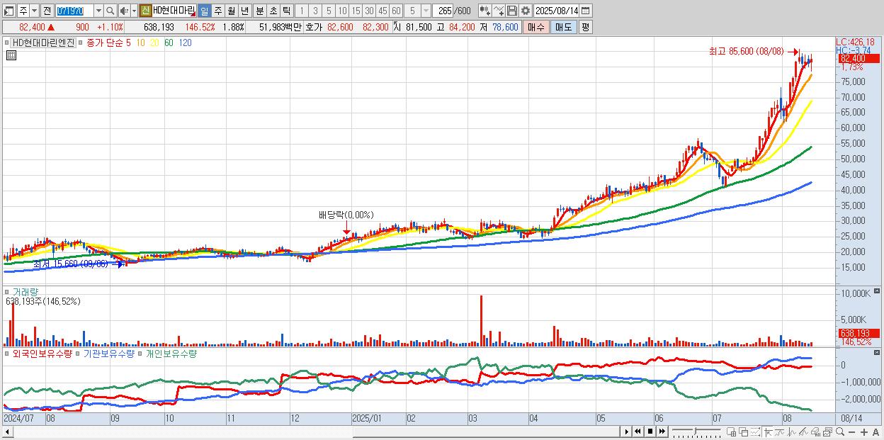 - HD현대마린엔진 (83,000원 ▲ 1.84% , 시총: 28,155억, 외국인 순매수 거래금:78억)
