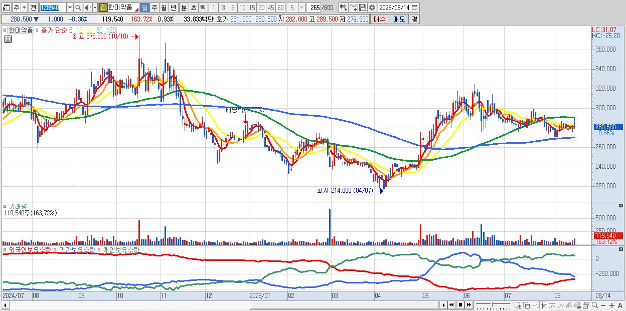 - 한미약품 (279,500원 ▼ -0.71% , 시총: 35,807억, 외국인 순매수 거래금:108억)