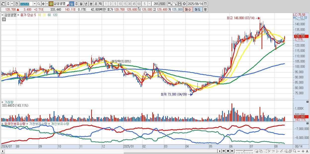 - 삼성생명 (128,500원 ▲ 2.55% , 시총: 257,000억, 외국인 순매수 거래금:119억)