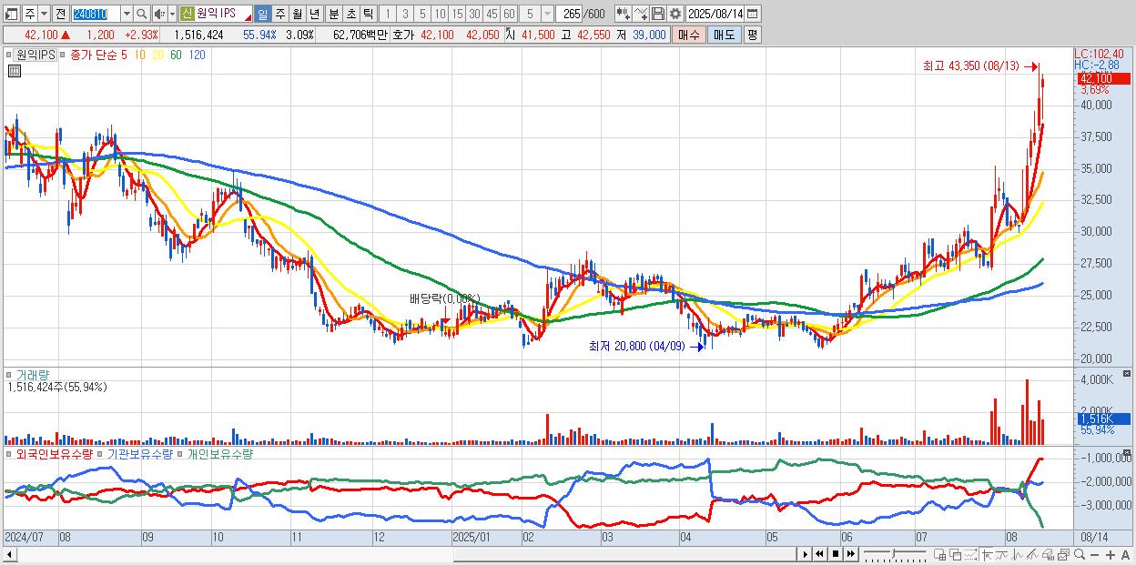 - 원익IPS (42,550원 ▲ 4.03% , 시총: 20,885억, 외국인 순매수 거래금:161억)
