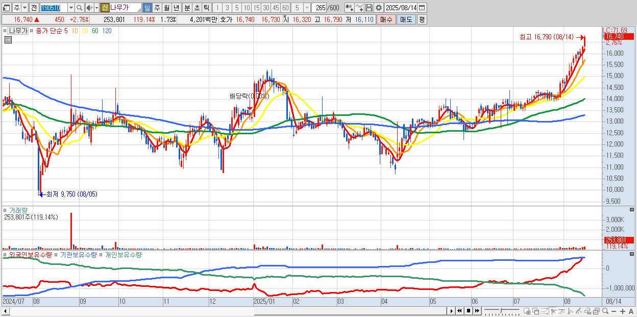 - 나무가 (16,740원 ▲ 2.76% , 시총: 2,458억, 거래량: 253,801, 거래대금:42억, KOSDAQ)
