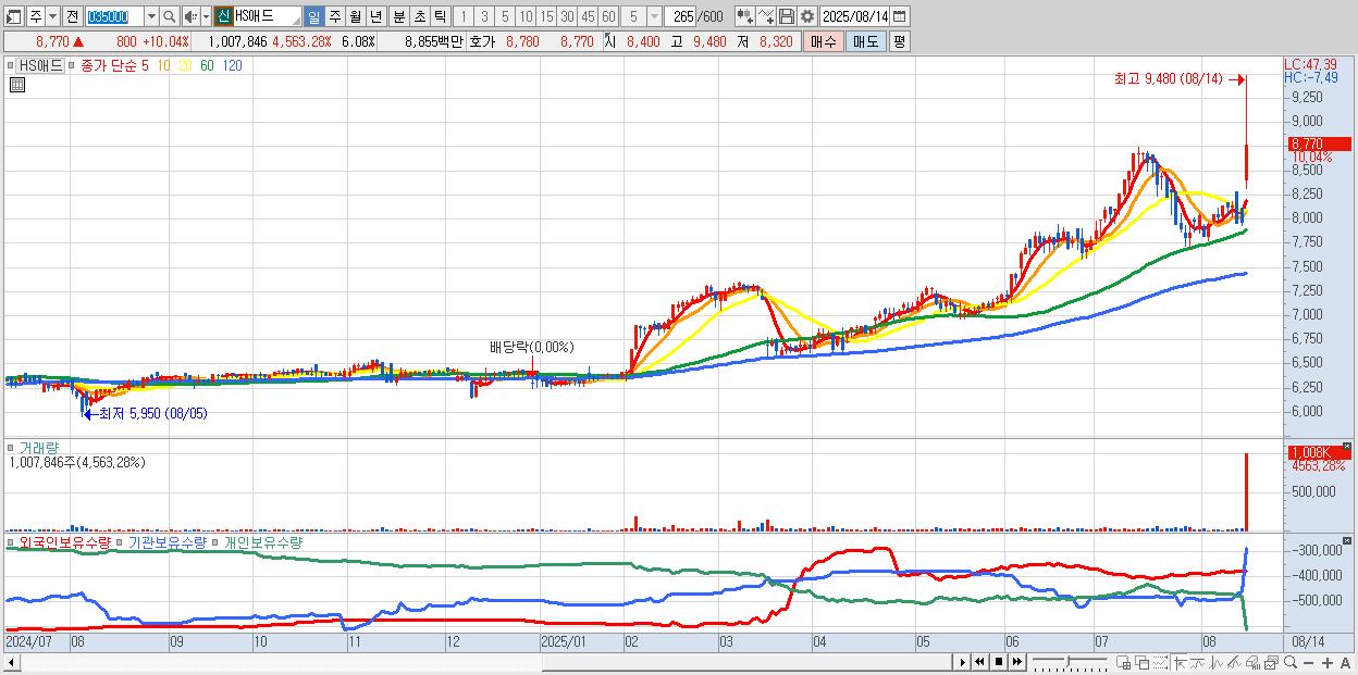 - HS애드 (8,770원 ▲ 10.04% , 시총: 1,453억, 거래량: 1,007,846, 거래대금:89억, KOSPI)