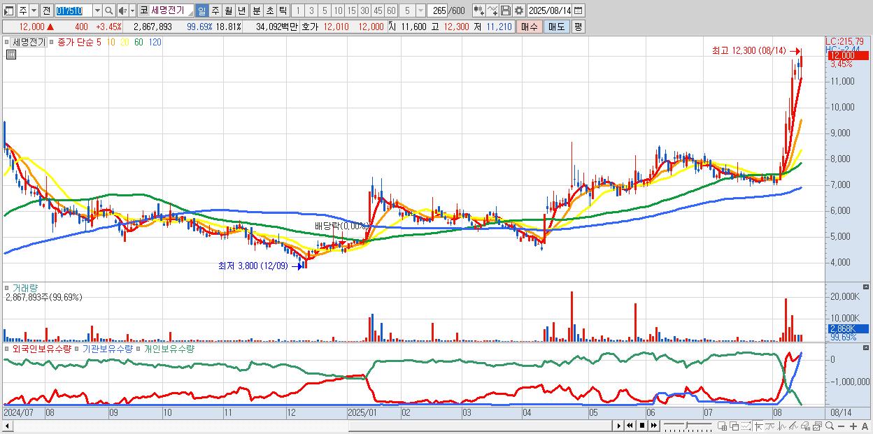 - 세명전기 (12,000원 ▲ 3.45% , 시총: 1,830억, 거래량: 2,867,893, 거래대금:341억, KOSDAQ)