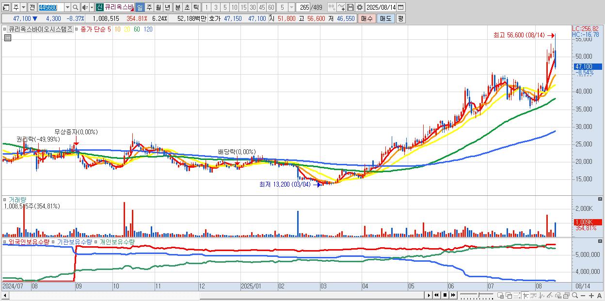 - 큐리옥스바이오시스템즈 (54,300원 ▲ 5.64% , 시총: 8,776억, 거래량: 345,900, 거래대금:186억, KOSDAQ)