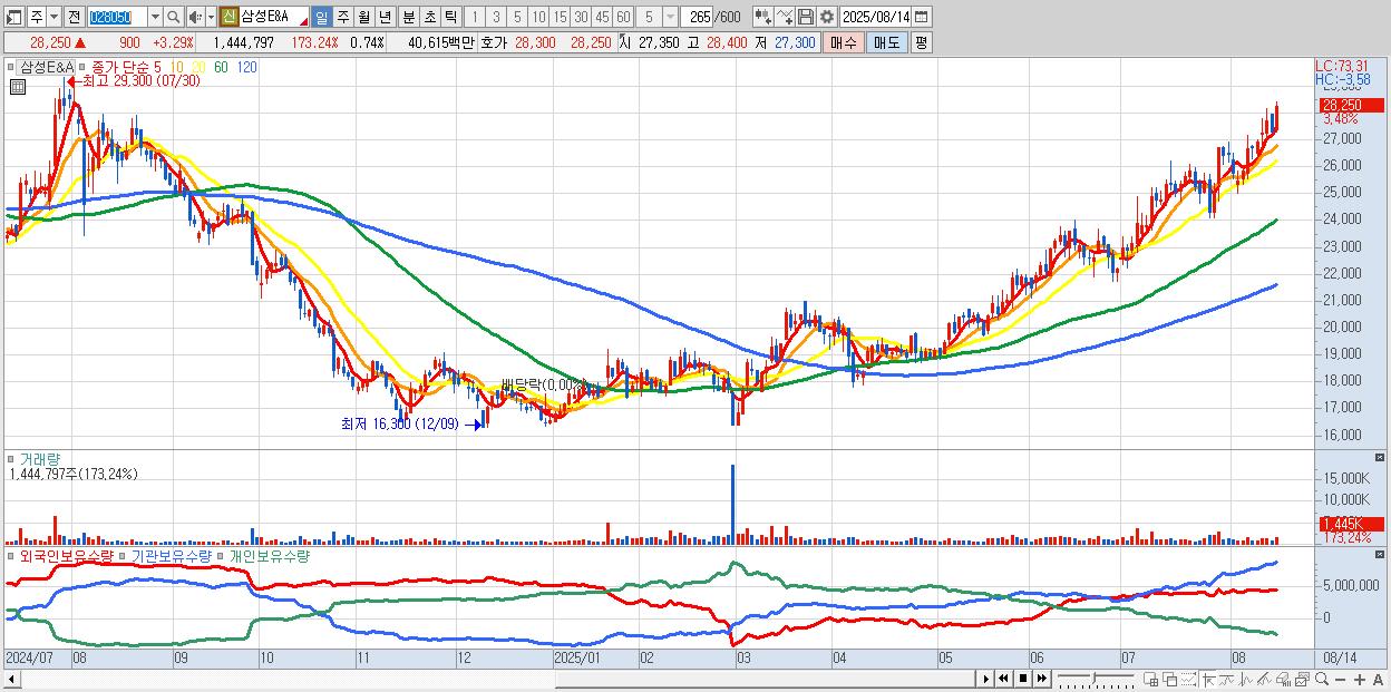 - 삼성E&A (28,150원 ▲ 2.93% , 시총: 55,174억, 거래량: 1,122,144, 거래대금:316억, KOSPI)