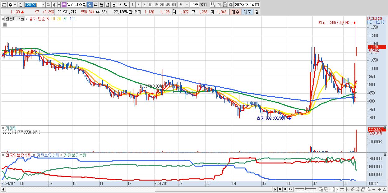 - 일진디스플 (1,130원 ▲ 9.39% , 시총: 582억, 거래량: 22,931,717, 거래대금:271억, KOSPI)