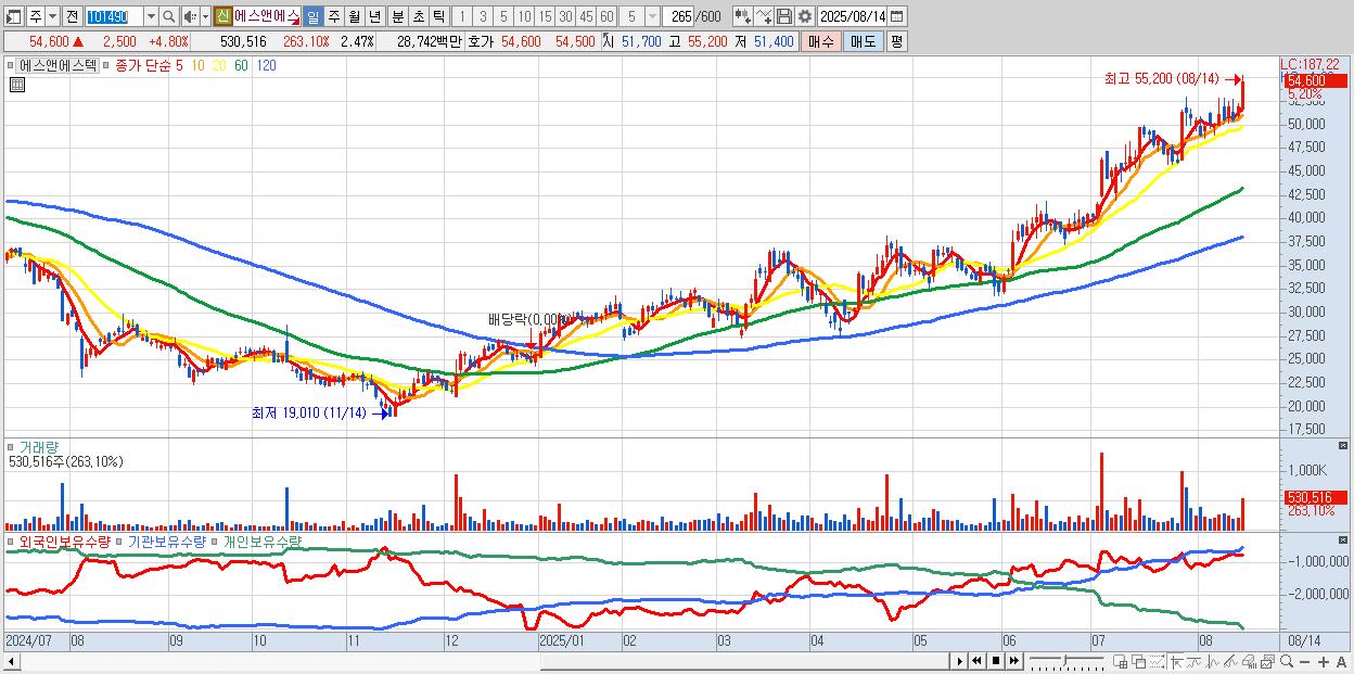 - 에스앤에스텍 (54,600원 ▲ 4.8% , 시총: 11,712억, 거래량: 381,319, 거래대금:207억, KOSDAQ)