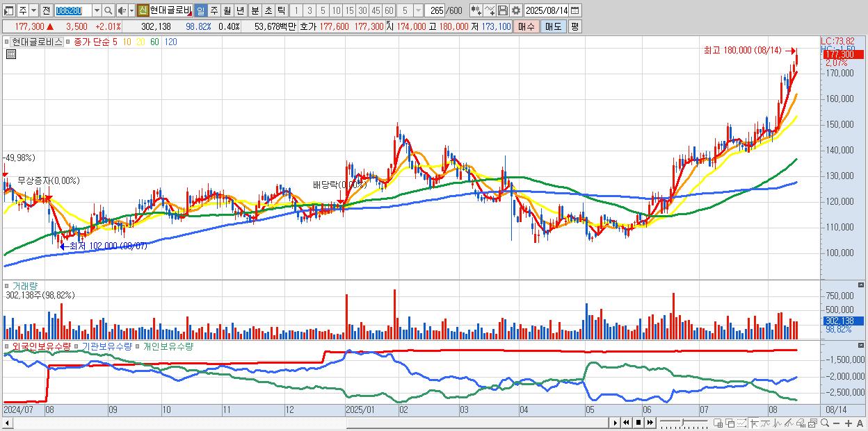 - 현대글로비스 (177,300원 ▲ 2.01% , 시총: 132,975억, 거래량: 262,927, 거래대금:467억, KOSPI)