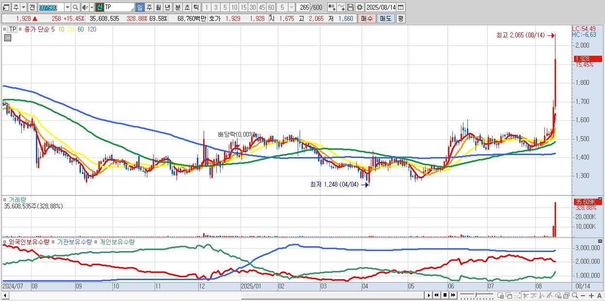 - TP (1,928원 ▲ 15.45% , 시총: 987억, 거래량: 35,608,535, 거래대금:688억, KOSPI)