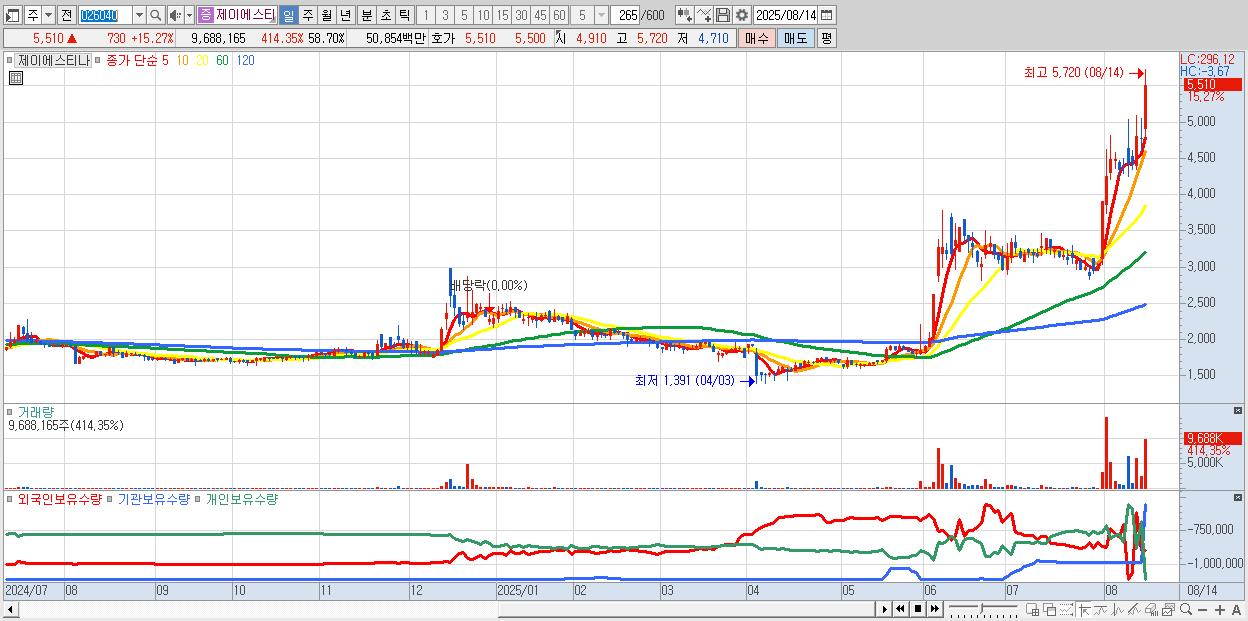 - 제이에스티나 (5,510원 ▲ 15.27% , 시총: 909억, 거래량: 9,688,165, 거래대금:509억, KOSDAQ)