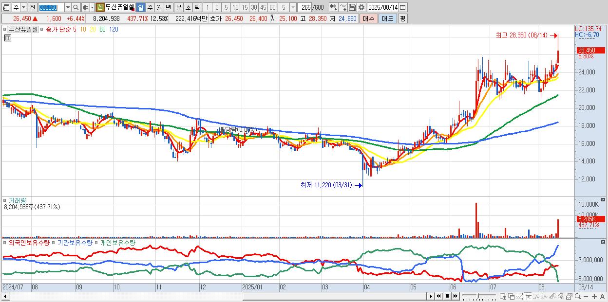 - 두산퓨얼셀 (26,150원 ▲ 5.23% , 시총: 17,127억, 거래량: 4,296,221, 거래대금:1,165억, KOSPI)