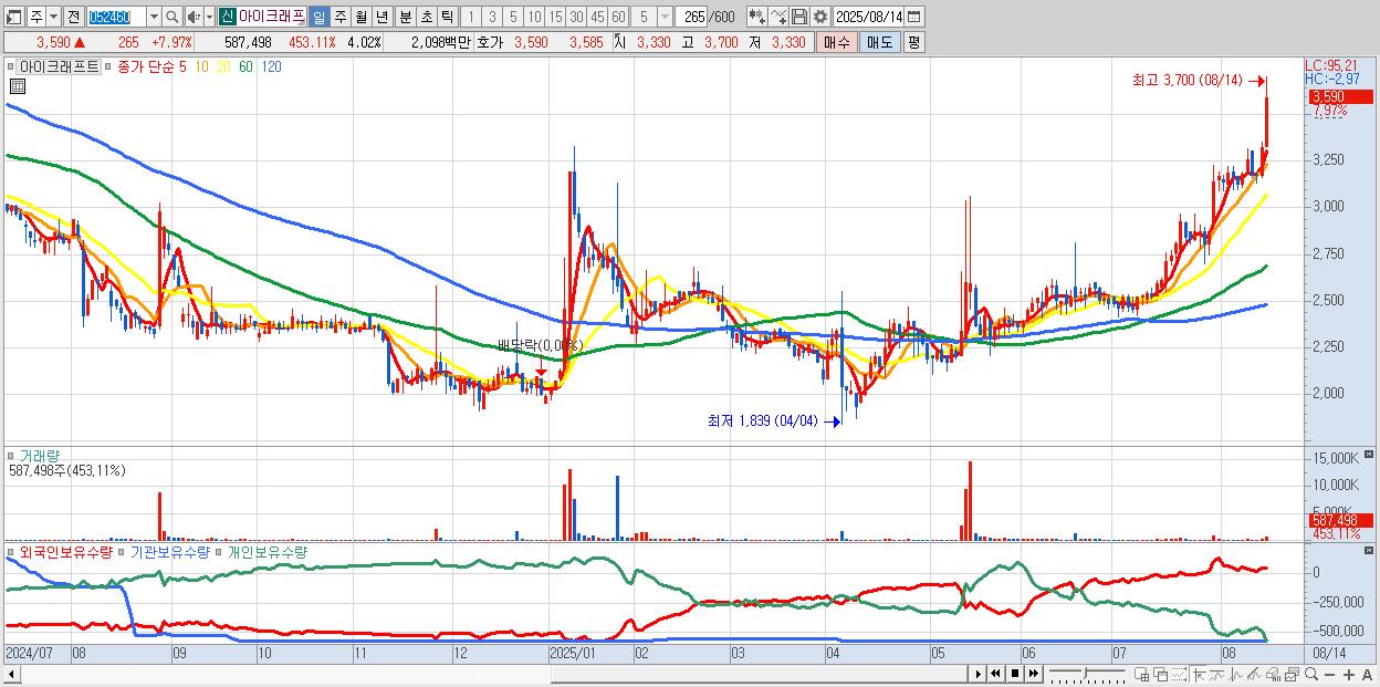 - 아이크래프트 (3,590원 ▲ 7.97% , 시총: 524억, 거래량: 587,498, 거래대금:21억, KOSDAQ)