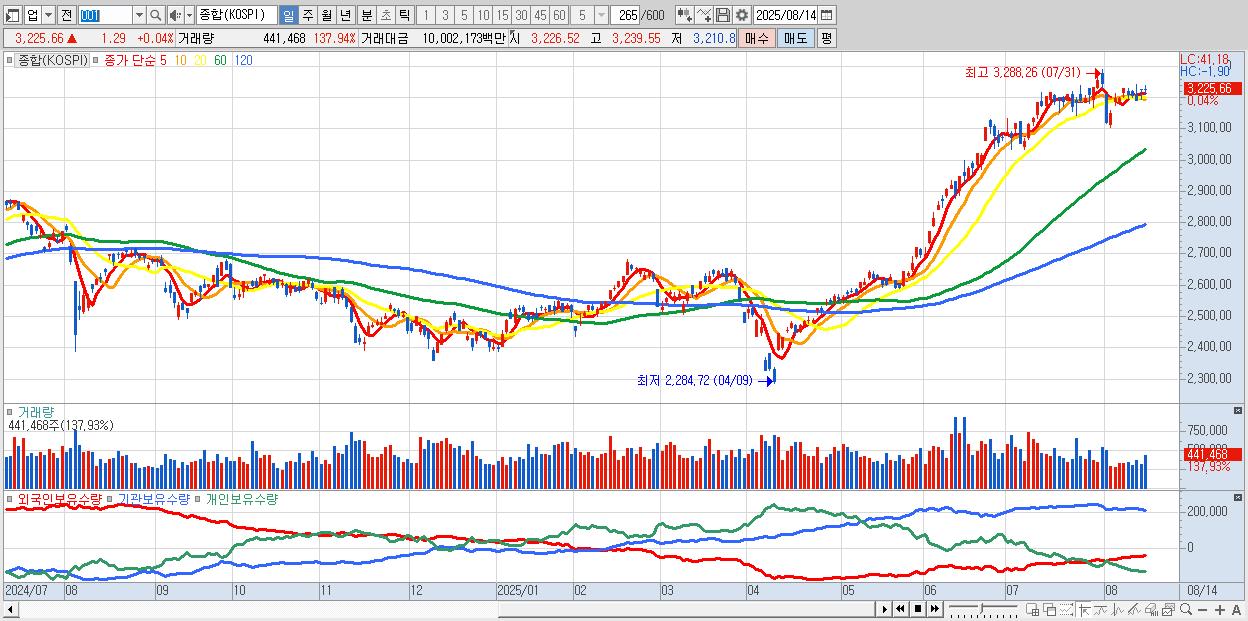 | 08/14 | 3,225.66 | ▲0.04% | -534억 | -779억 | 197억 | 1,116억 |