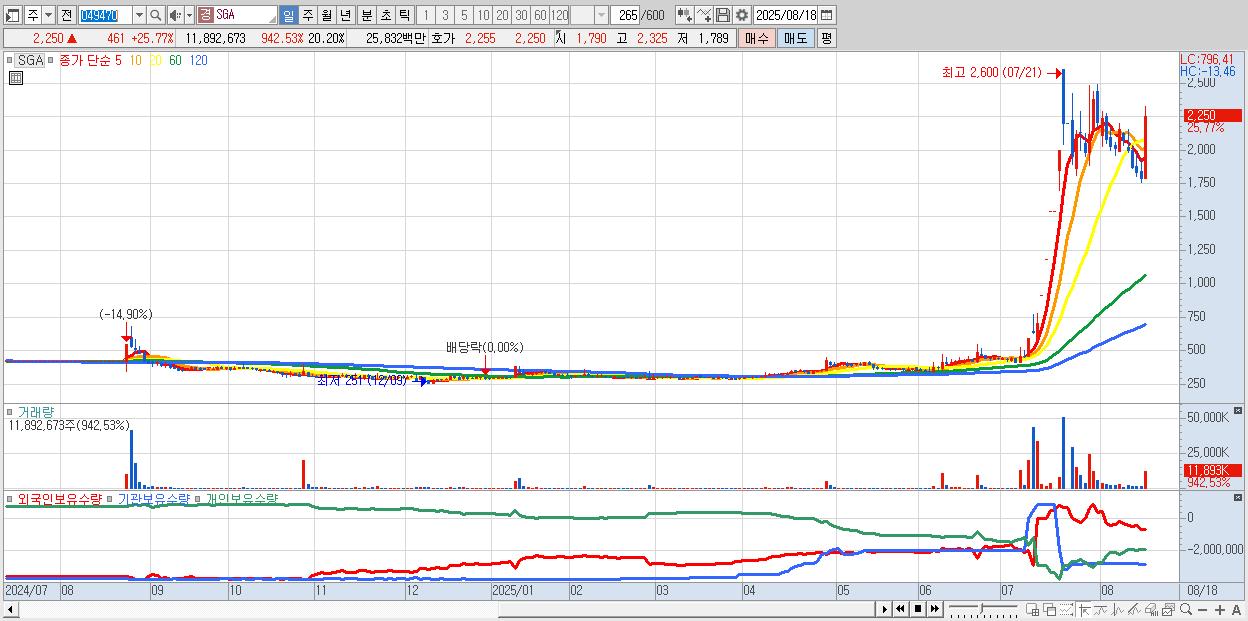 - SGA (2,250원 ▲ 25.77% , 시총: 1,324억, 거래량: 11,892,673, 거래대금:258억)