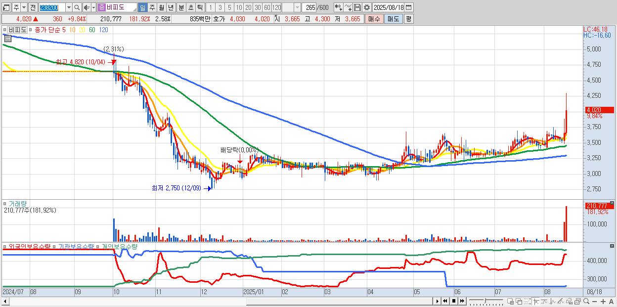 - 비피도 (4,020원 ▲ 9.84% , 시총: 329억, 거래량: 210,777, 거래대금:8억)