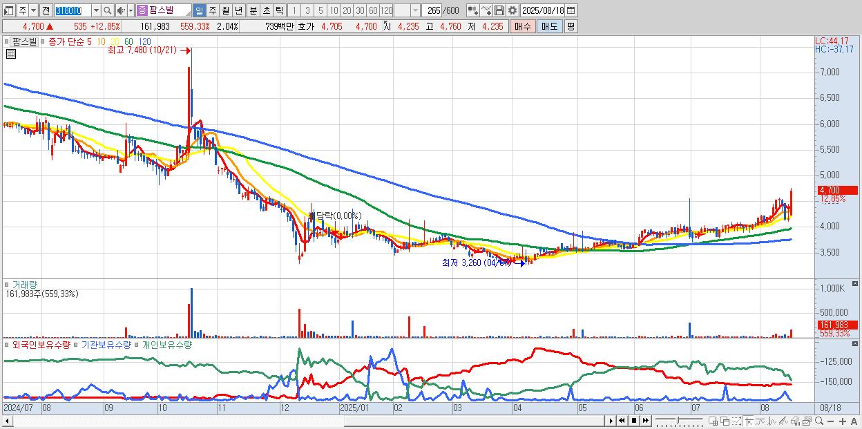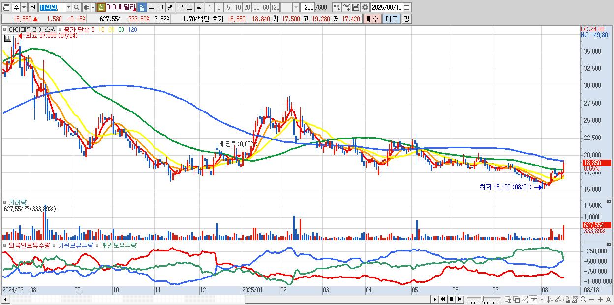 - 아이패밀리에스씨 (18,800원 ▲ 8.86% , 시총: 3,256억, 거래량: 430,855, 거래대금:80억)