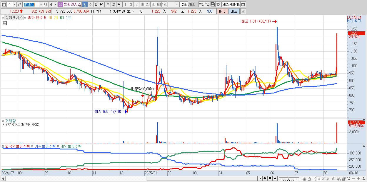 - 정원엔시스 (1,223원 ▲ 29.97% , 시총: 394억, 거래량: 3,772,608, 거래대금:44억)