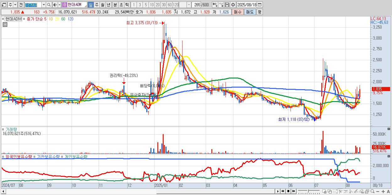 - 현대ADM (1,835원 ▲ 9.75% , 시총: 887억, 거래량: 16,070,621, 거래대금:295억)