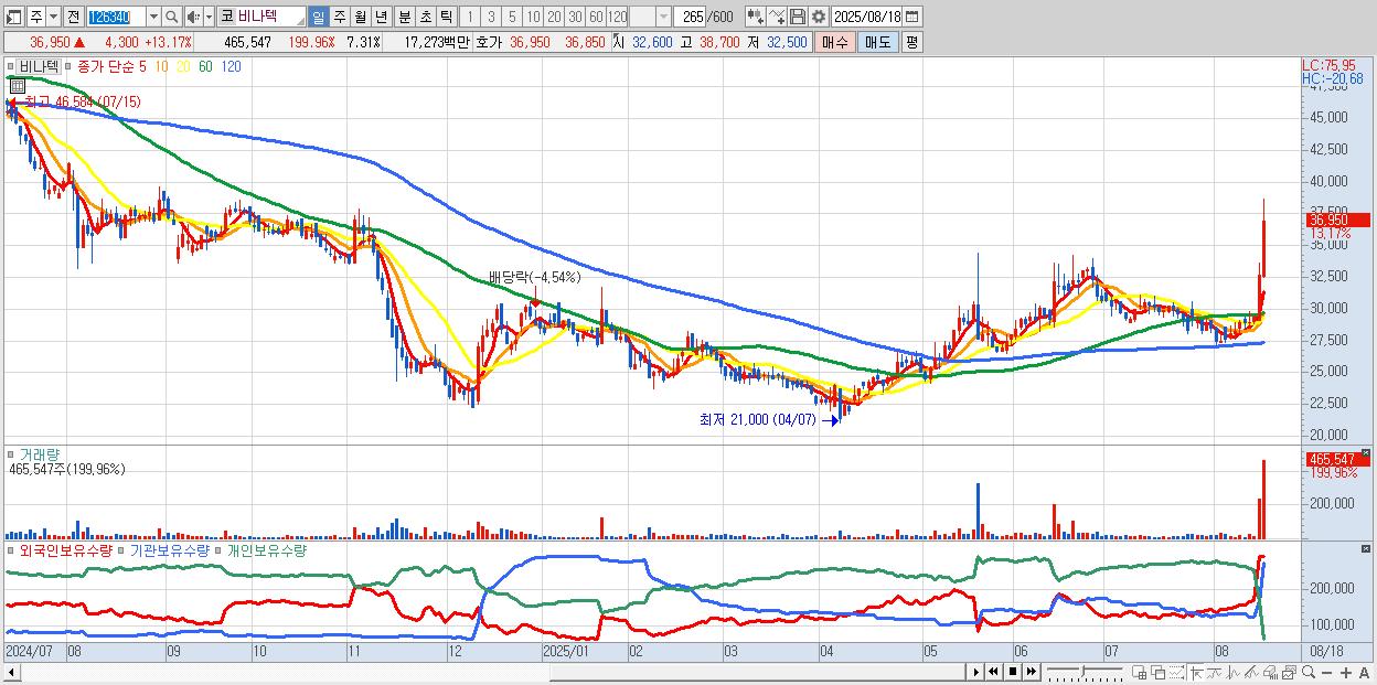 - 비나텍 (36,950원 ▲ 13.17% , 시총: 2,355억, 거래량: 465,547, 거래대금:173억)