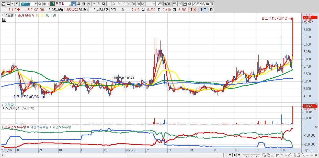 - 푸드웰 (7,410원 ▲ 30% , 시총: 741억, 거래량: 3,053,960, 거래대금:214억)