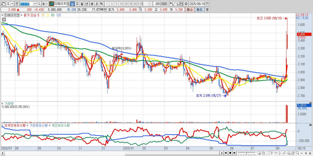 - 티에이치엔 (3,480원 ▲ 9.43% , 시총: 626억, 거래량: 5,080,600, 거래대금:179억)