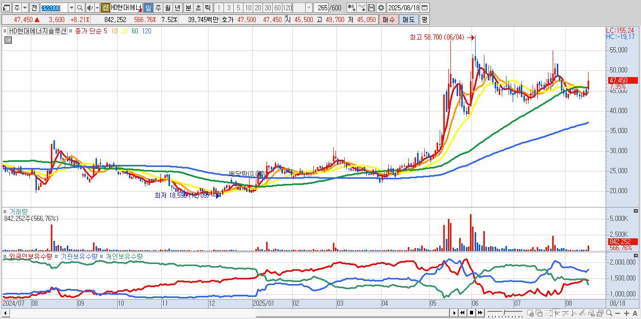 - HD현대에너지솔루션 (47,750원 ▲ 8.89% , 시총: 5,348억, 거래량: 470,816, 거래대금:223억)
