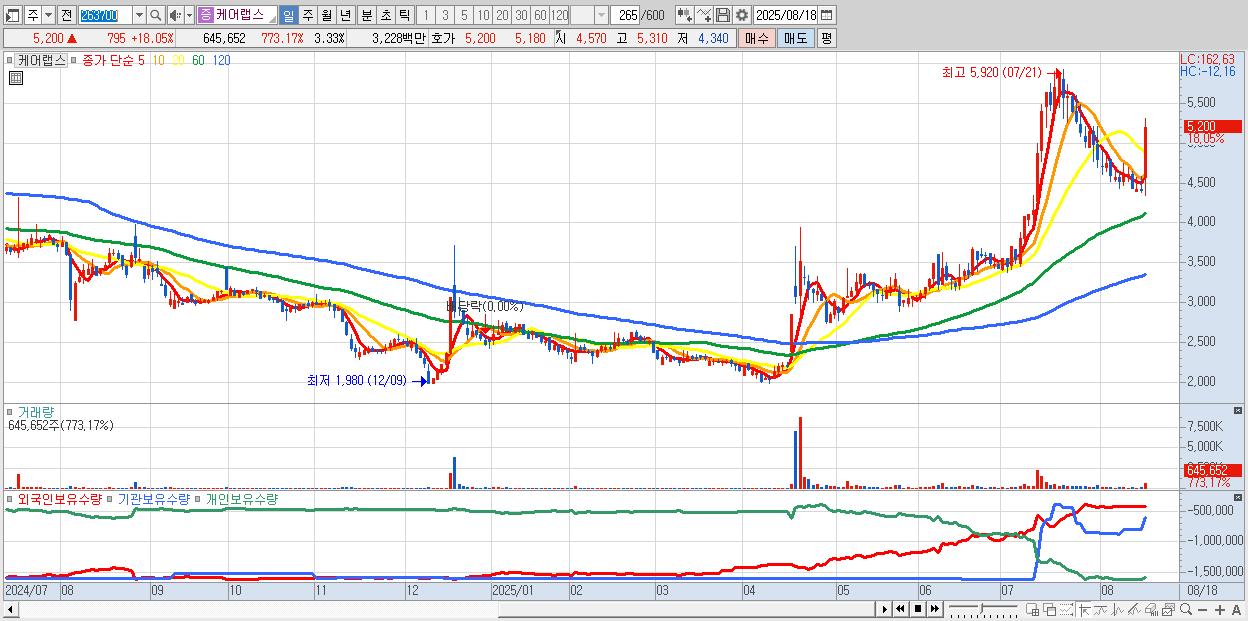 - 케어랩스 (5,200원 ▲ 18.05% , 시총: 1,010억, 거래량: 645,652, 거래대금:32억)