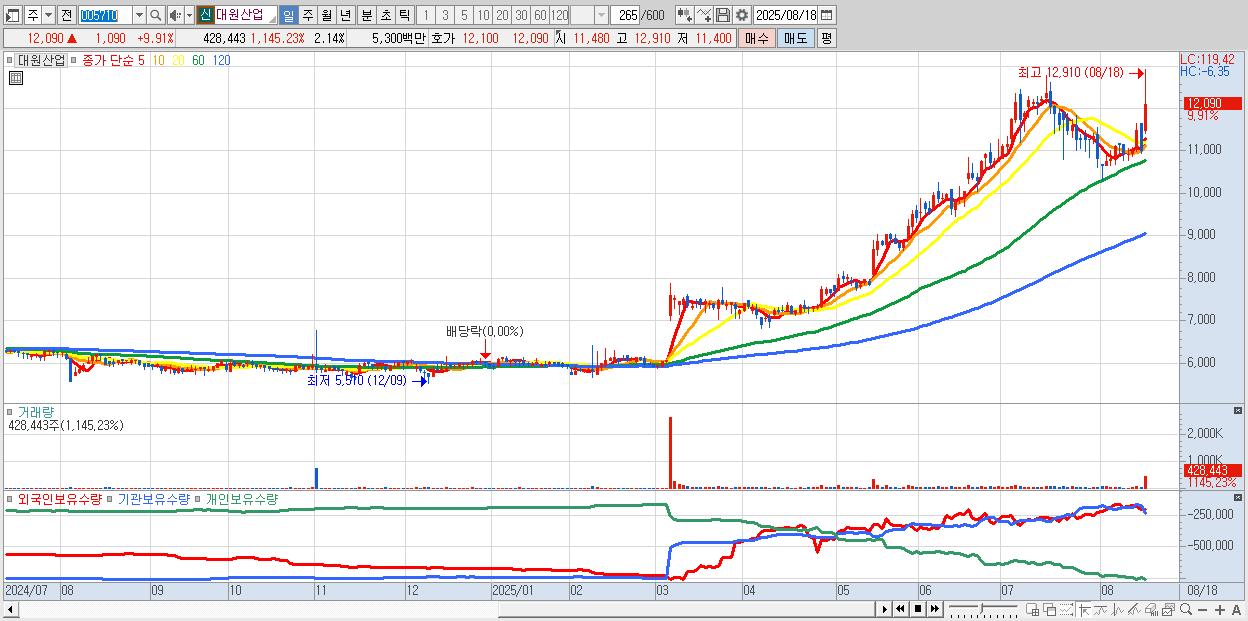 - 대원산업 (12,090원 ▲ 9.91% , 시총: 2,423억, 거래량: 428,443, 거래대금:53억)