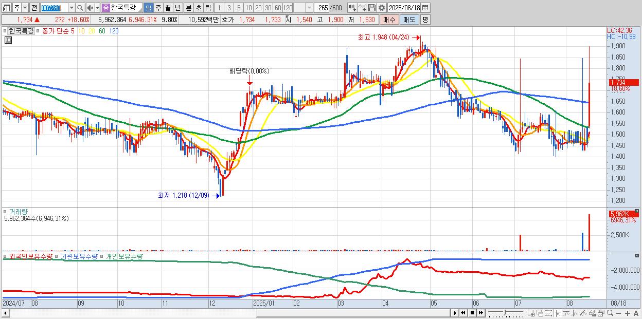 - 한국특강 (1,734원 ▲ 18.6% , 시총: 1,055억, 거래량: 5,962,364, 거래대금:106억)