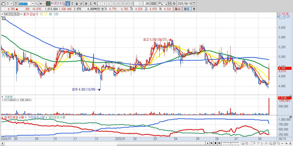 - NICE인프라 (4,765원 ▲ 8.67% , 시총: 1,627억, 거래량: 1,013,664, 거래대금:48억)