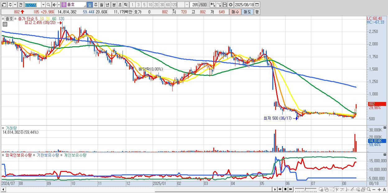 - 율호 (802원 ▲ 29.98% , 시총: 577억, 거래량: 14,814,382, 거래대금:112억)