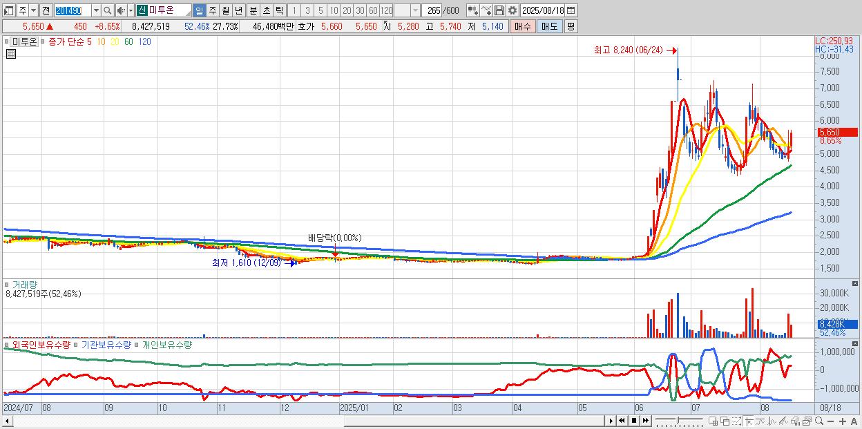 - 미투온 (5,650원 ▲ 8.65% , 시총: 1,717억, 거래량: 8,427,519, 거래대금:465억)