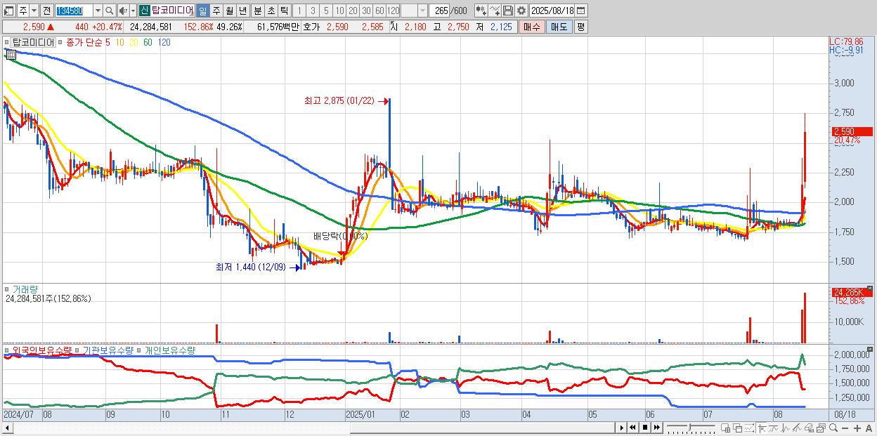 - 탑코미디어 (2,590원 ▲ 20.47% , 시총: 1,277억, 거래량: 24,284,581, 거래대금:616억)