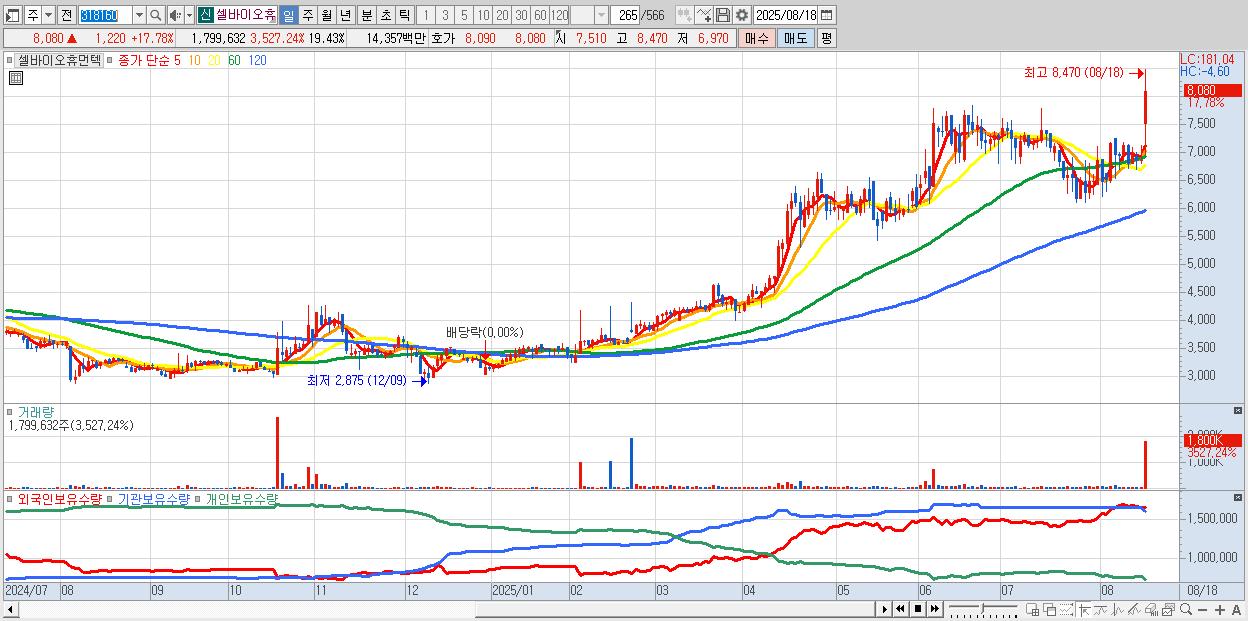 - 셀바이오휴먼텍 (8,080원 ▲ 17.78% , 시총: 748억, 거래량: 1,799,632, 거래대금:144억)