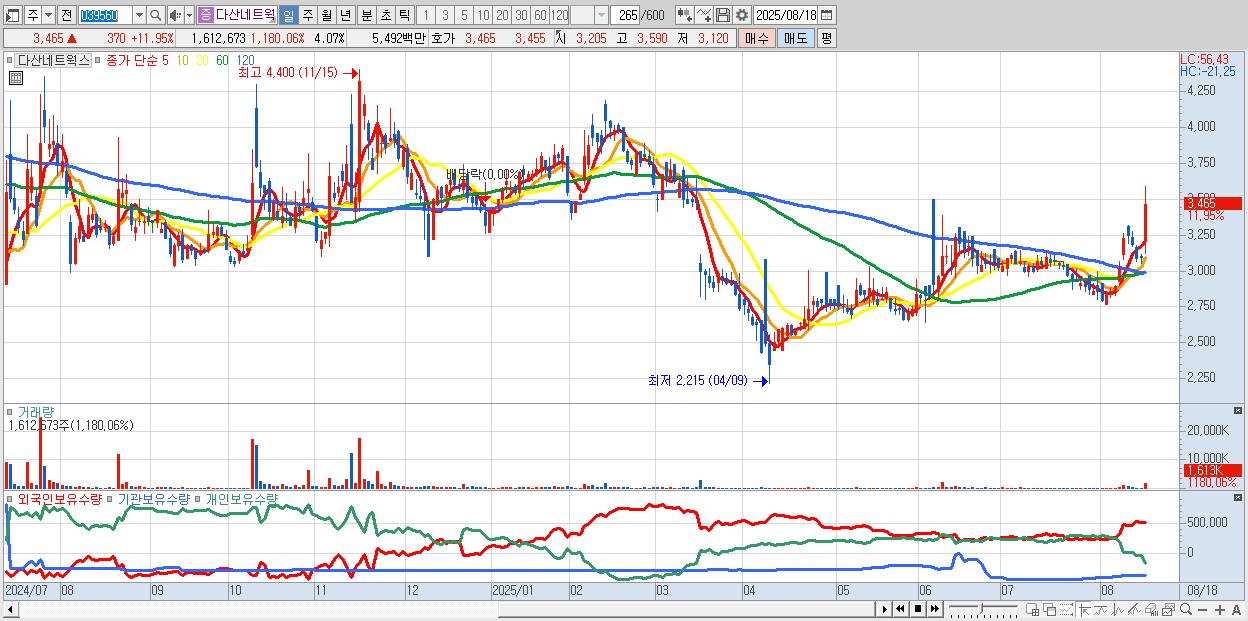 - 다산네트웍스 (3,465원 ▲ 11.95% , 시총: 1,373억, 거래량: 1,612,673, 거래대금:55억)