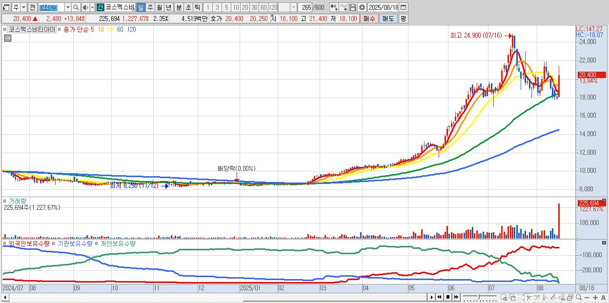 - 코스맥스비티아이 (20,400원 ▲ 13.84% , 시총: 1,959억, 거래량: 225,694, 거래대금:45억)